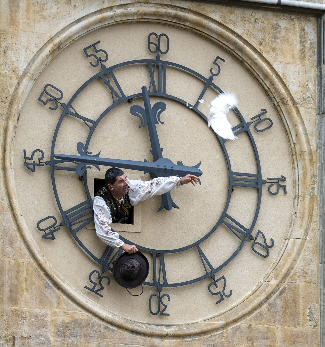 Pasadas las 11:30 horas, Ángel Rufino de Haro inició la subida hasta la campana grande del templo, 'María de la O'. Asomado al reloj instalado en uno de los laterales de la Torre de las Campanas, incluyó una variación en su ritual. Desde este punto soltó a la primera de las palomas blancas, que fue la primera en "emprender el camino a casa" ya que se encontraba en período de cría.