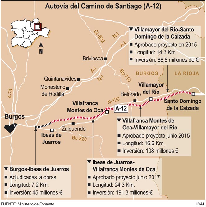 El Ministerio de Fomento aprueba definitivamente el proyecto del tramo Villafranca de Montes de Oca-Ibeas de Juarros (Burgos) de la Autovía del Camino de Santiago (A-12), para llevar a cabo las expropiaciones de los terrenos necesarios. El presupuesto de licitación estimado es de 158,1 millones de euros (IVA excluido), según informó hoy en un comunicado el departamento de Íñigo de la Serna.