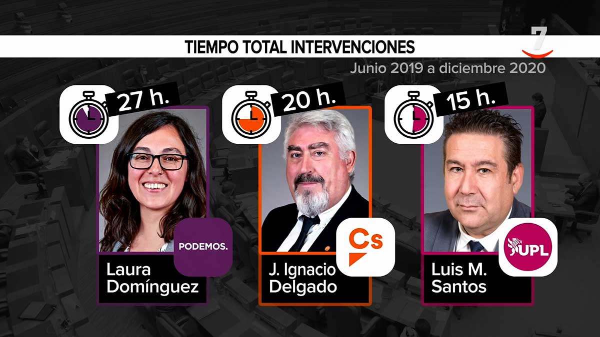 La actividad de esta legislatura también se mide por número de intervenciones. En este caso, la procuradora por Ciudadanos, María Montero, habría realizado 103 pero Laura Domínguez (Podemos-Equo) sumaría más minutos, exactamente 27 horas de participación: "Trabajamos en muchas comisiones, presentamos muchas iniciativas y eso se convierte en más tiempo". En cambio, el presidente de la Junta de Castilla y León, Alfonso Fernández Mañueco, estaría en el cuarto puesto con casi los mismos minutos que la consejera de Sanidad.