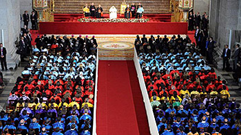 A estos profesores --la mayoría vestidos con las togas y birretes, como es habitual en los actos académicos-- les ha dicho que sienten un "anhelo de algo más elevado", les ha explicado que la Universidad, que "no es casualidad que promoviera la Iglesia", encarna "un ideal que no debe desvirtuarse ni por ideologías cerradas al diálogo racional, ni por servilismos de una lógica utilitarista de simple mercado, que ve al hombre como mero consumidor".