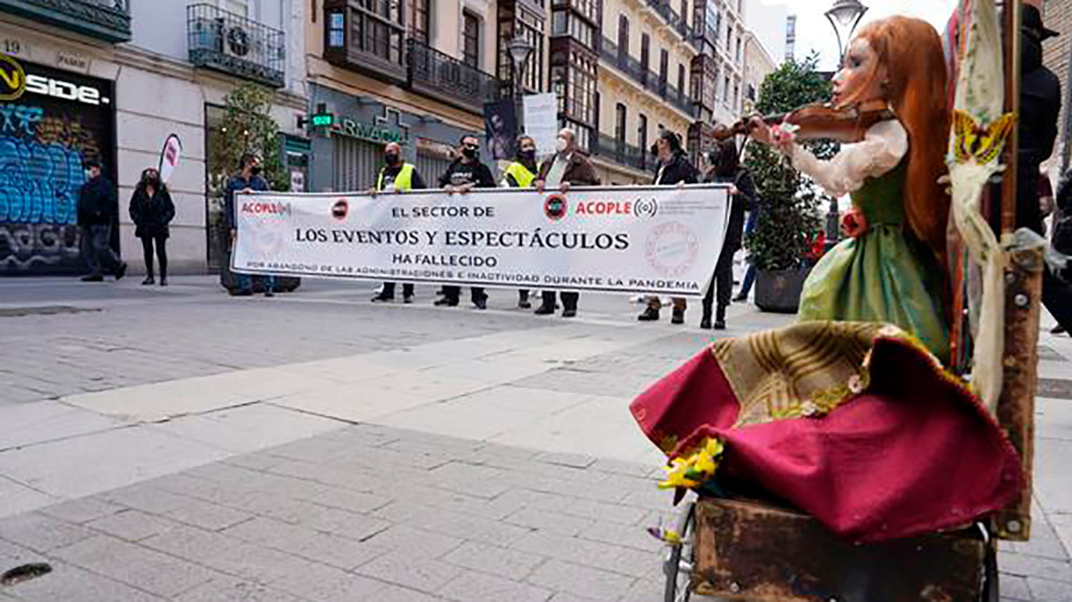 Los manifestantes acompañan la marcha con una gran pancarta a modo de esquela, que rezaba "El sector de los eventos y espectáculos ha fallecido"