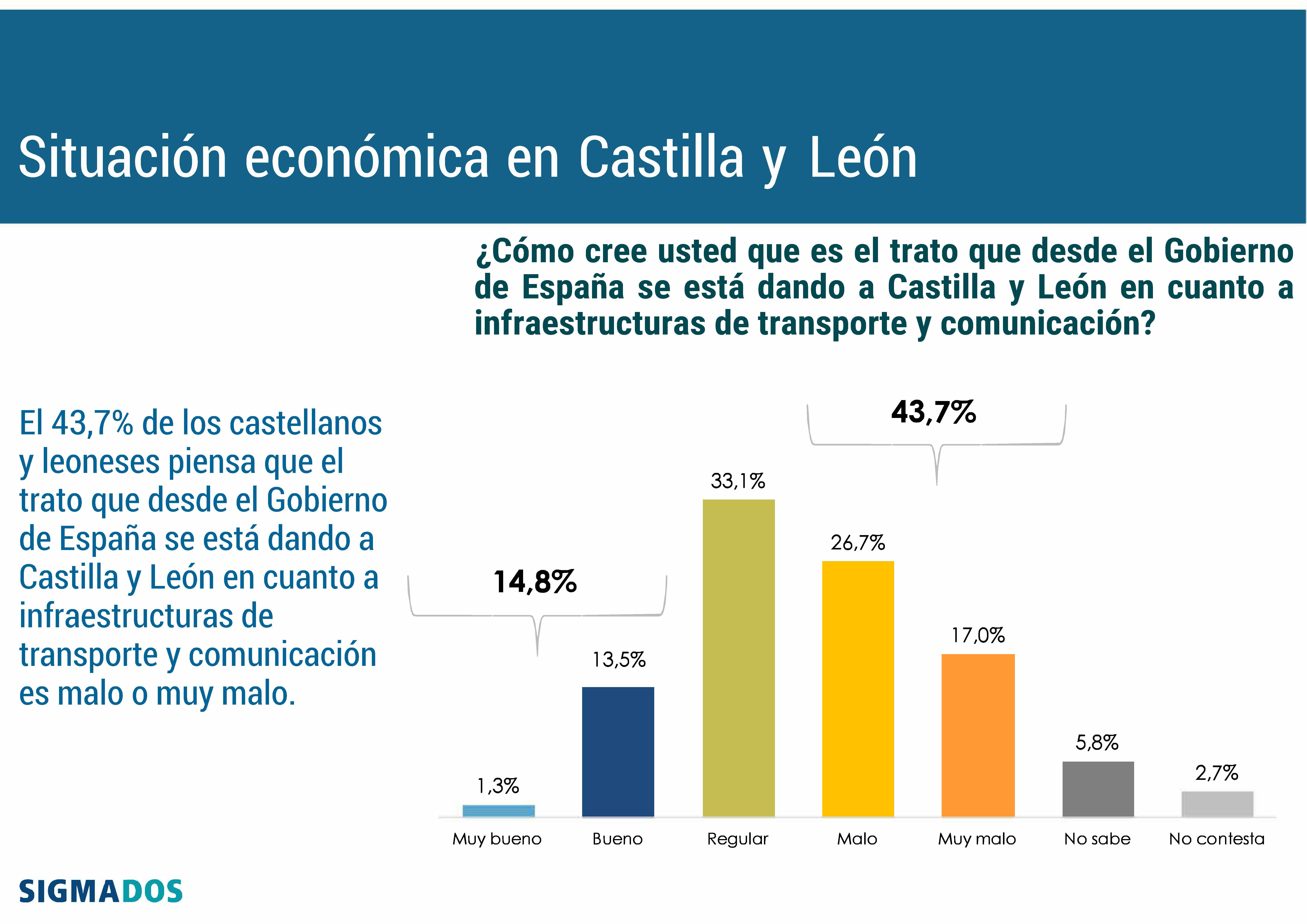 El 43,7% de los castellanos y leoneses afirma que el trato que el Gobierno de España está dando a Castilla y León en cuanto a infraestructuras de transporte y comunicación es malo o muy malo. El 33,1% lo considera regular y para el 14,8% es bueno o muy bueno, tal y como se desprende del barómetro de Sigma Dos para CyLTV coincidiendo con el cierre del año.