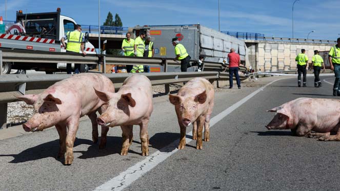Un camión cargado de cerdos volcó en la circunvalación de Soria, en la carretera SO-20, en la zona de la rotonda de ‘El caballo blanco’, lo que provocó retenciones a la salida de la capital, ya que además del vehículo volcado varios animales se encontraban deambulando por la carretera.