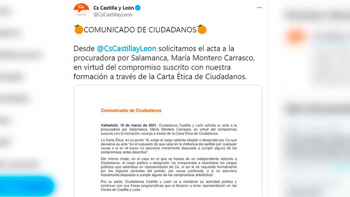 Ciudadanos Castilla y León ha solicitado el acta a la procuradora por Salamanca María Montero Carrasco, que este viernes ha anunciado su decisión de abandonar el Grupo Parlamentario de la formación 'naranja' pero permanecer en su escaño en las Cortes regionales.