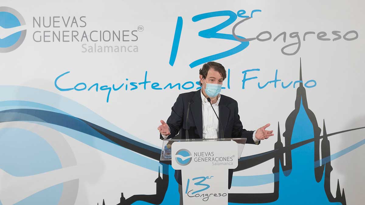 El presidente de la Junta y del PP Castilla y León, Alfonso Fernández Mañueco, reiteró este viernes la necesidad de cumplir los pactos firmados para "culminar el proyecto de transformación en Castilla y León", durante la inauguración del Congreso de Nuevas Generaciones de Salamanca en la que apeló a "la unidad" e incidió en "la lealtad" para cerrar filas en torno al líder nacional, Pablo Casado.