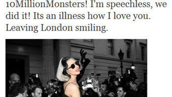 Lady Gaga celebró esta manera, por supuesto a través de su Twitter, la cifra de los 10 millones de seguidores: "10 millones, mounstros! Estoy sin palabras, lo hicimos! Es una enfermedad lo que os quiero a todos! Dejo Londres con una sonrisa".