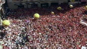 Abajo, en la plaza Consistorial, las miles de personas que aguardaban el momento del chupinazo han alzado sus pañuelos rojos al grito de 'San Fermín, San Fermín' y han estallado de alegría cuando han escuchado el chupinazo.
