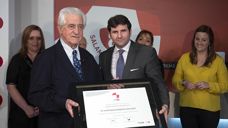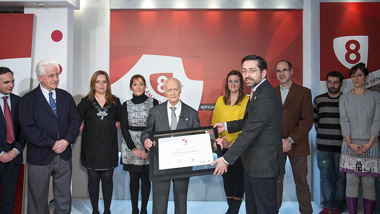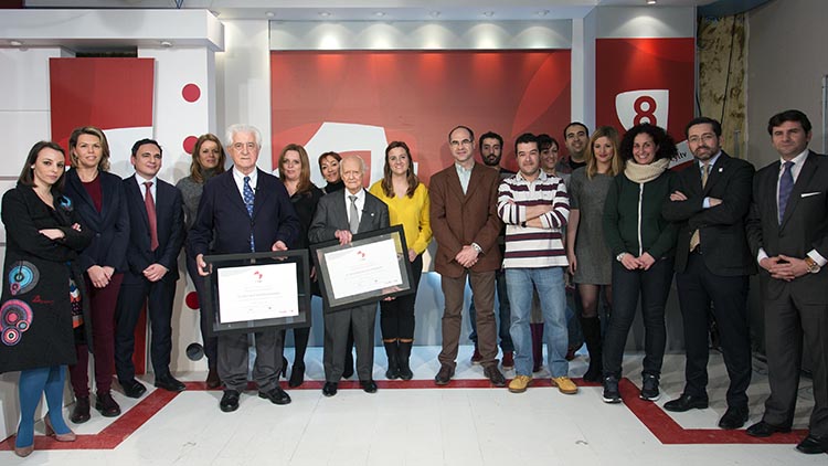Arropados por los profesionales de La 8 Salamanca, el prestigioso escultor y el célebre matador de toros han recibido el título de manos de Eduardo Álvarez, director general de RTVCyL, y Antonio Penela, director de La 8 Salamanca