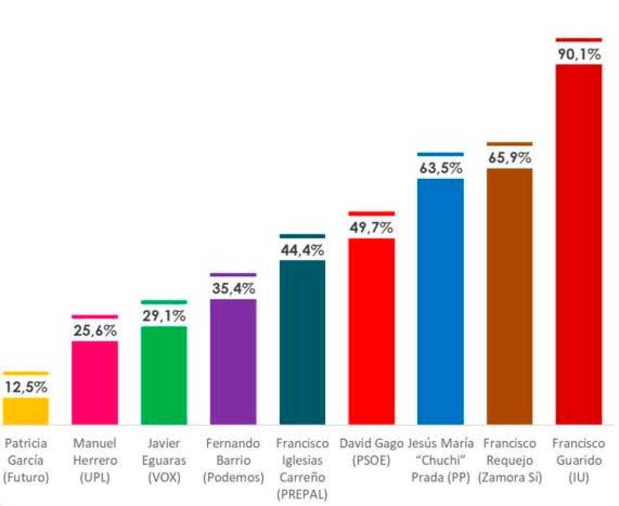 Respecto a la valoración, el actual alcalde de la ciudad, Francisco Guarido, de IU, y David Gago, del PSOE, son quienes cuentan con una mejor valoración, empatando con una nota de 5,8. A continuación se sitúan el líder del PP Jesús María Prada que obtiene un 5,4 y Francisco Requejo de Zamora Sí, que registra un 5,2.