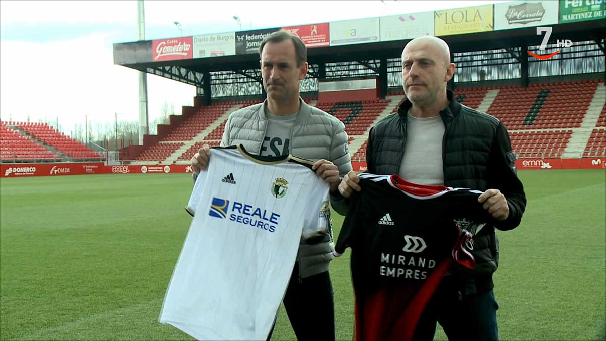 Joseba Exteberría y Julián Calero posan juntos con sus camisetas, una imagen que Mirandés y Burgos han plasmado para que los aficionados rojillos y blanquinegros vivan el derbi con la mayor de las cordialidades. El partido del domingo, declarado de alto riesgo, contará con un amplio dispositivo policial. Habrá lleno absoluto en las gradas. Lo primordial es que el domingo solo se hable de fútbol y del espectáculo futbolístico que se pueda vivir en Anduva.