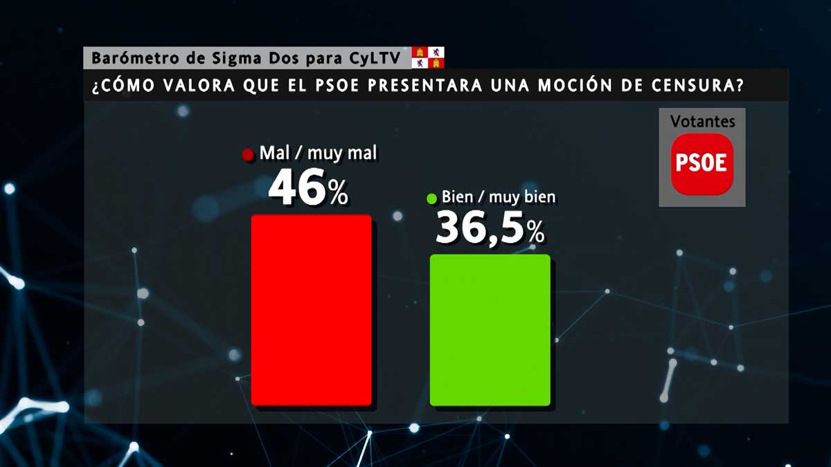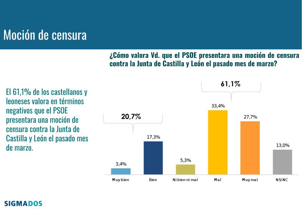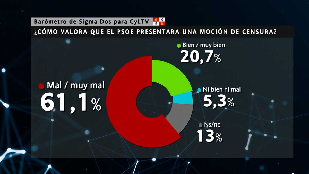 El 61,1% de los castellanos y leoneses valoran negativamente la iniciativa del PSOE de presentar una moción de censura contra la Junta de Castilla y León, según el sondeo de Sigma Dos para CyLTV coincidiendo con el primer semestre del año. Los datos muestran una posición contraria a la moción de censura mayoritaria en todos los segmentos de población y en todo los grupos electorales salvo entre los votantes de Unidas Podemos.