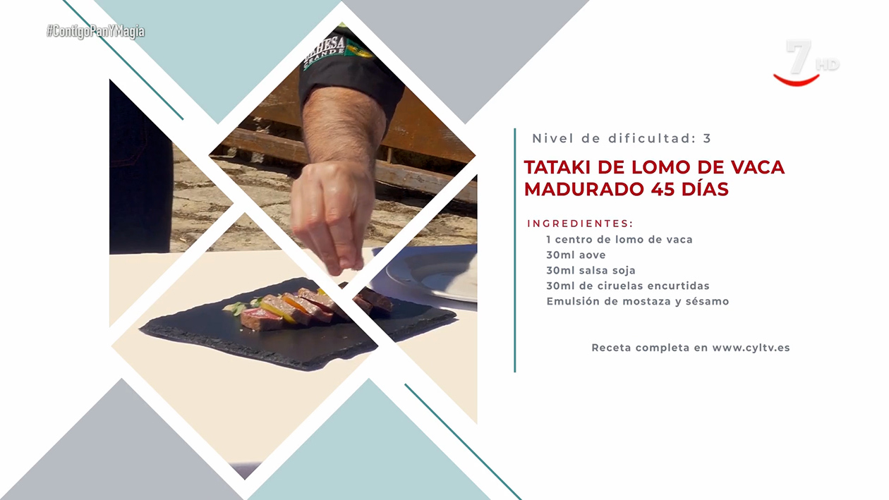 Tataki de lomo de vaca madurado 45 días, ciruelas encurtidas y emulsión de mostaza y sésamo