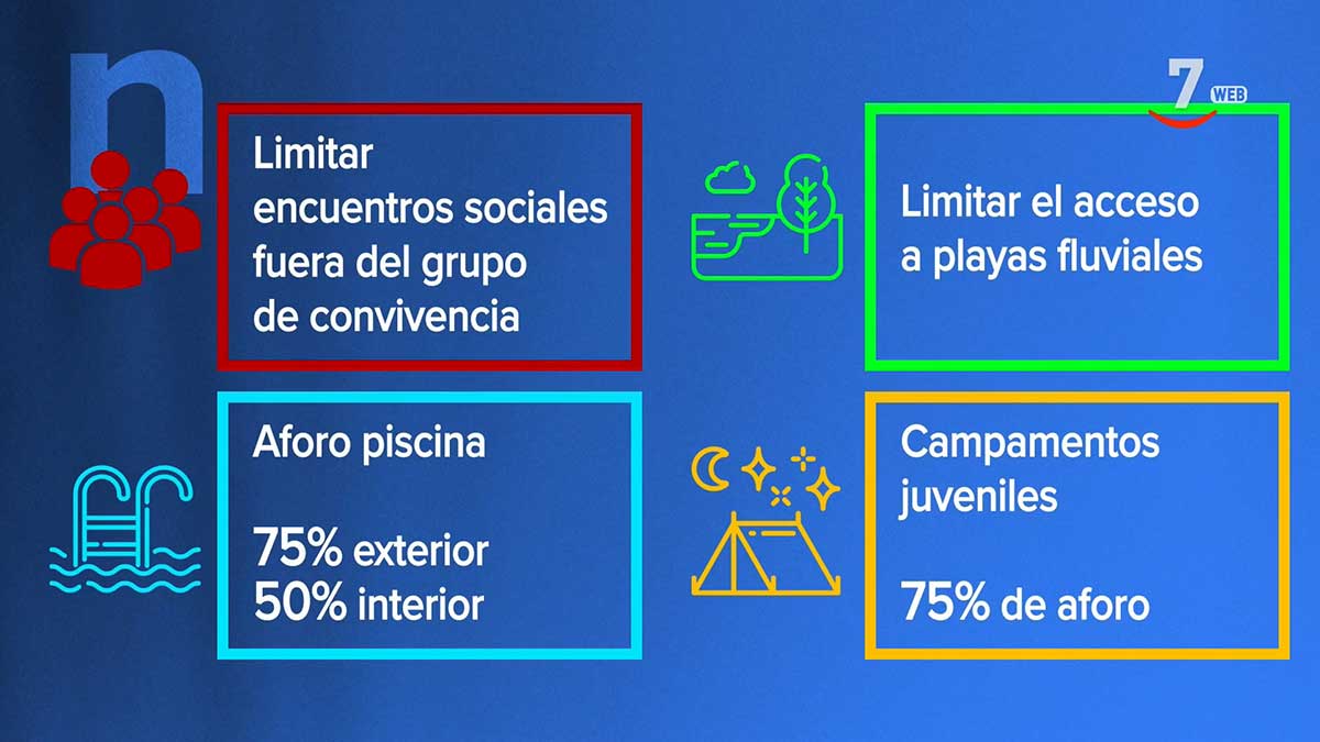 Se plantean además reducir el aforo máximo en piscinas al aire libre al 75% y en piscinas cubiertas al 50%, y aconsejan adelantar el horario de cierre en una hora al habitualmente establecido. Las limitaciones se plantean también para el acceso a playas fluviales y lacustres a partir de las 20:00 horas.