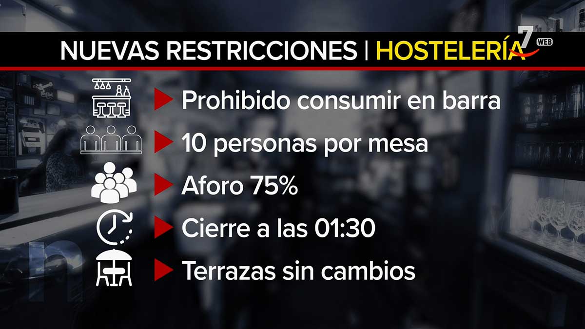 El cierre tendrá que ser a la 01.30 de la madrugada como máximo y no podrán admitir nuevos clientes a partir de la 01.00 de la madrugada. Se exceptúa a los servicios de entrega a domicilio o recogida en el establecimiento.