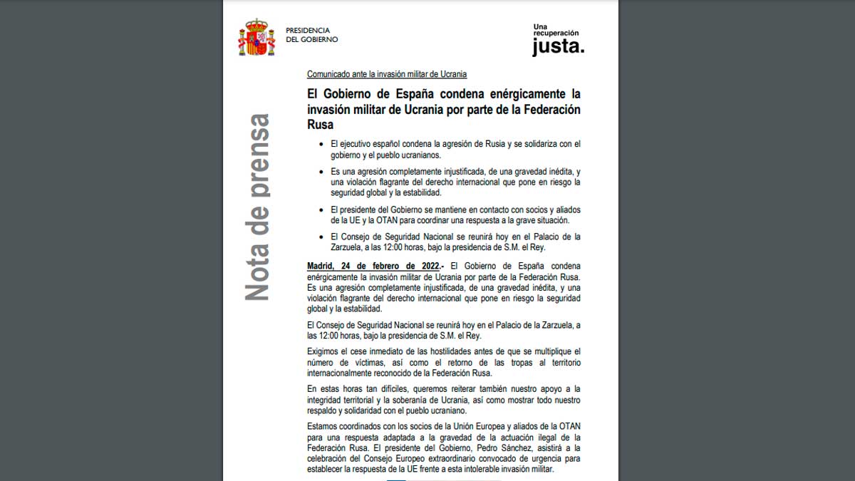 El Gobierno de España condena enérgicamente la invasión militar de Ucrania por parte de la Federación Rusa. Es una agresión completamente injustificada, de una gravedad inédita, y una violación flagrante del derecho internacional que pone en riesgo la seguridad global y la estabilidad.