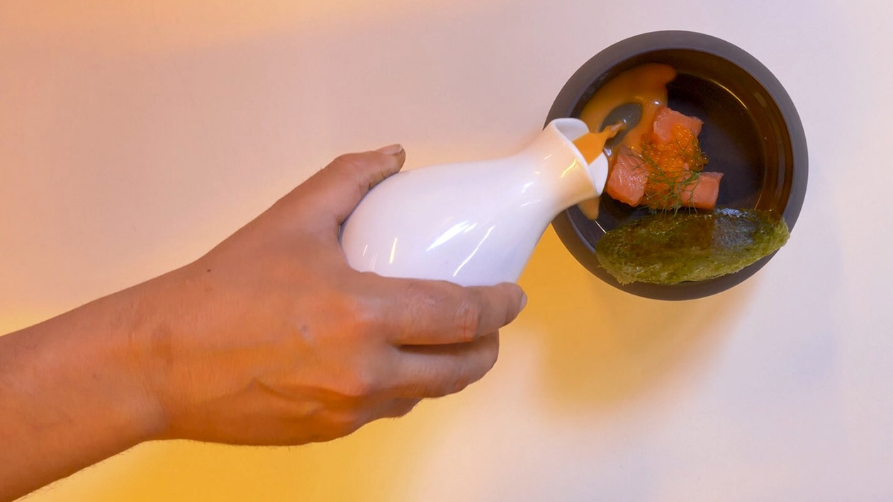 Comenzamos desespinando en lomos sin piel la trucha. Utilizamos las pieles y las espinas para preparar un caldo, que posteriormente colamos. Introducimos el pimiento morrón durante 20 minutos.