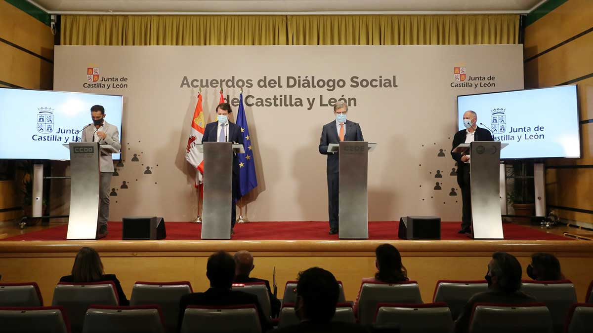 El presidente de la Junta de Castilla y León, Alfonso Fernández Mañueco, el Secretario General de UGT Castilla y León, Faustino Temprano, el Secretario General de CCOO Castilla y León, Vicente Andrés, y el presidente de CEOE Castilla y León, Santiago Aparicio, han firmado tres grandes acuerdos en materia de políticas sociales y empleo en el marco del Diálogo Social. En concreto, los documentos consensuados son el Acuerdo en materia de Atención a las Personas en Situación de Dependencia 2021; la III Estrategia Integrada de Empleo, Formación Profesional, Prevención de Riesgos Laborales e Igualdad, Corresponsabilidad y Juventud en el Empleo, 2021-2024, y el Plan Anual de Empleo de Castilla y León 2021.