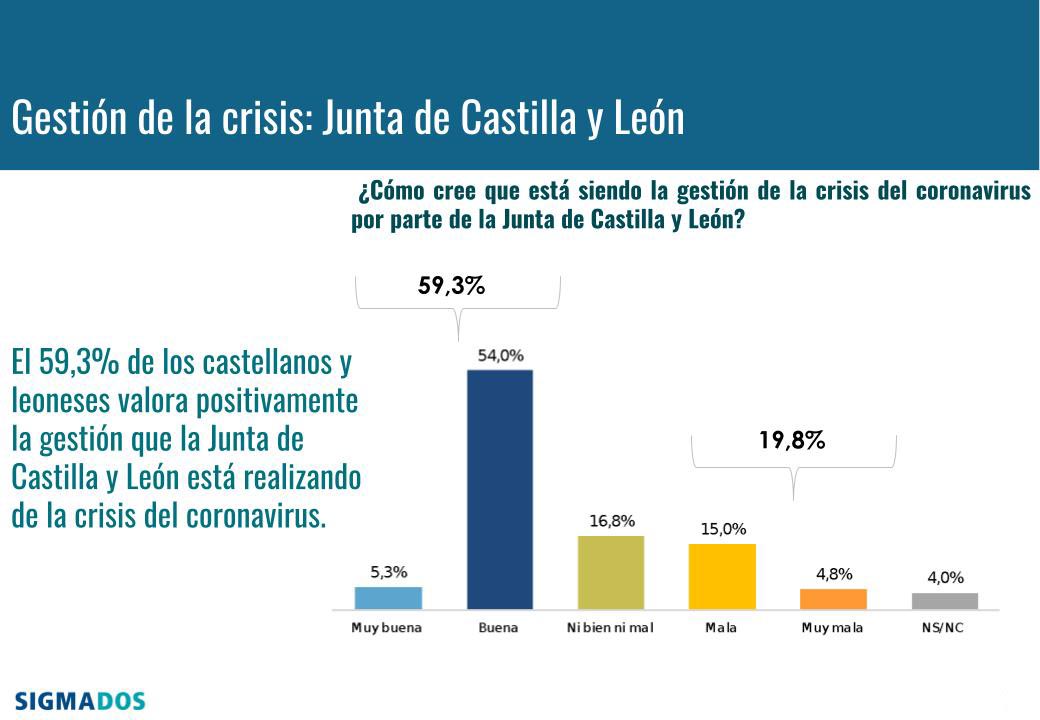 Dos de cada tres castellanos y leoneses, el 59,3%, valora positivamente la gestión que el Gobierno regional está realizando de la crisis del coronavirus, frente al 19,8% que opina que está siendo mala o muy mala, según los datos registrados en la encuesta de Sigma Dos para CyLTV.
