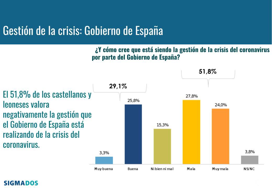En lo que se refiere a la gestión de la crisis por parte del Ejecutivo central, la encuesta refleja el predominio de valoraciones negativas, ya que para el 51,8% de los castellanos y leoneses es mala o muy mala frente al 29,1 que sostiene que es buena o muy buena.
