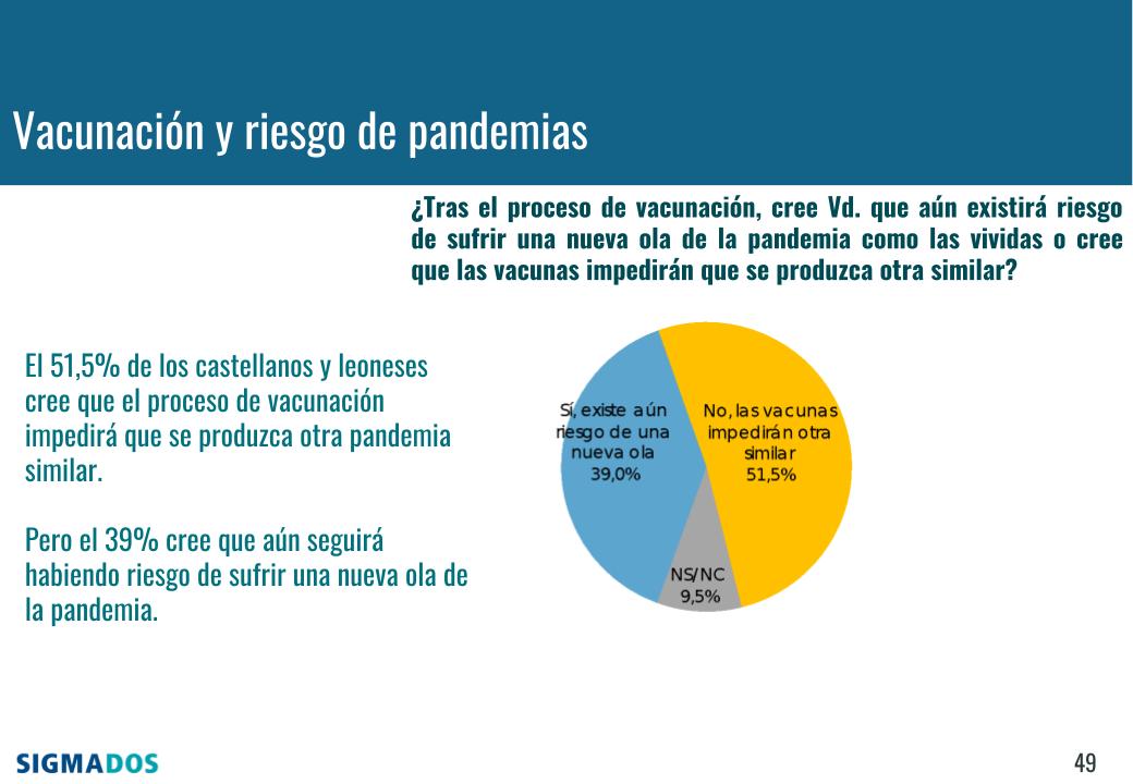 Los datos desprendidos del sondeo revelan que la mitad de los castellanos y leoneses, el 51,5%, considera que la finalización del proceso de vacunación impedirá que se produzca otra pandemia similar a la vivida. Por el contrario, el 39% de la población encuestada muestra incertidumbre sobre la inmunización generada por los antídotos y manifiesta que aún seguirá habiendo riesgo de sufrir una nueva ola del coronavirus.