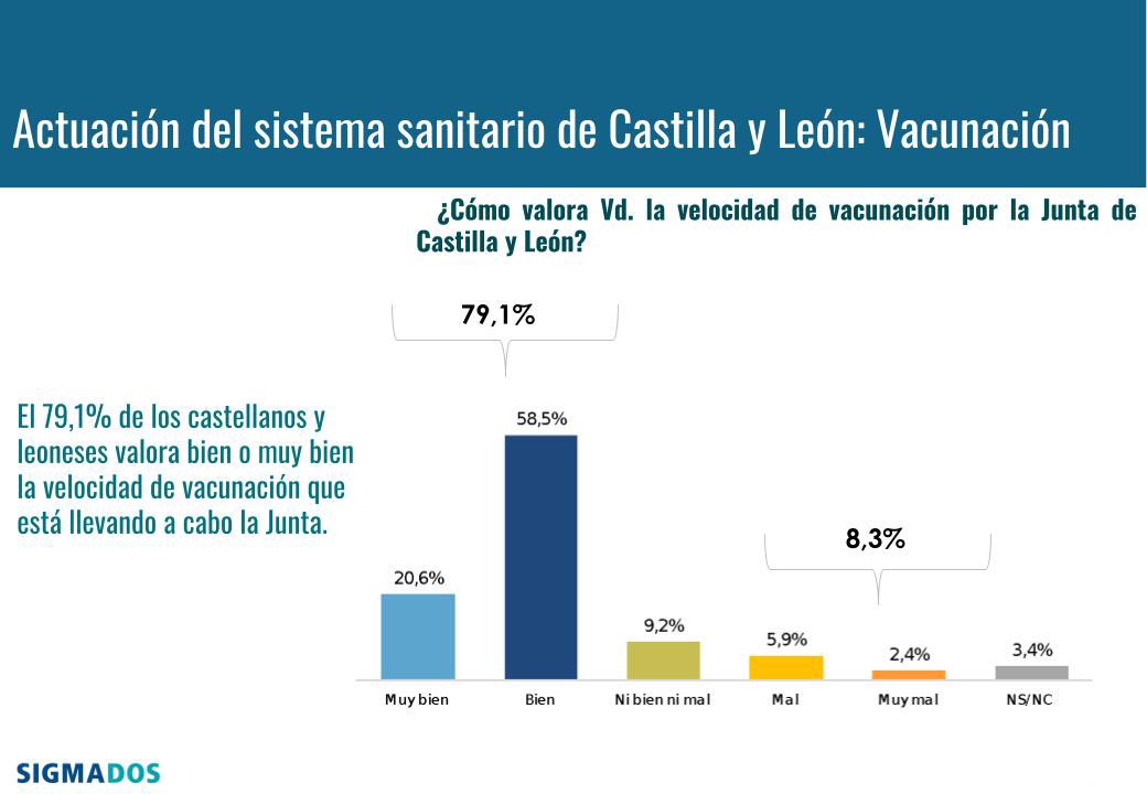 En lo que se refiere a la velocidad de la vacunación, casi cuatro de cada cinco castellanos y leoneses, el 79,1%, estima que el ritmo de vacunación llevado a cabo por la Junta de Castilla y León contra el coronavirus, presidida por Alfonso Fernández Mañueco, es bueno o muy bueno, frente al 8,3% que lo considera malo o muy malo.