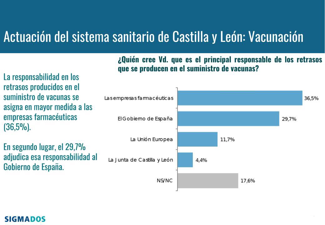Los castellanos y leoneses consideran que la mayor responsabilidad respecto a los retrasos que se producen en el suministro de vacunas corresponde a las empresas farmacéuticas. El 36,5% atribuye a este sector el problema, seguido de la responsabilidad en la gestión por parte del Gobierno central (29,7%), la Unión Europea (11,7%) y la Junta de Castilla y León (4,4%).