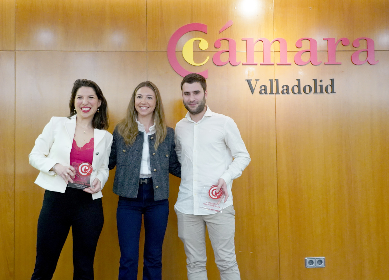 Noemí Morante y Jorge Iglesias, redactora y operador de cámara de La 8 Valladolid, han recibido esta mañana el Premio de Periodismo de la Cámara de Valladolid en la modalidad de Televisión por el reportaje 'Gala MOVA: entre bambalinas'.
